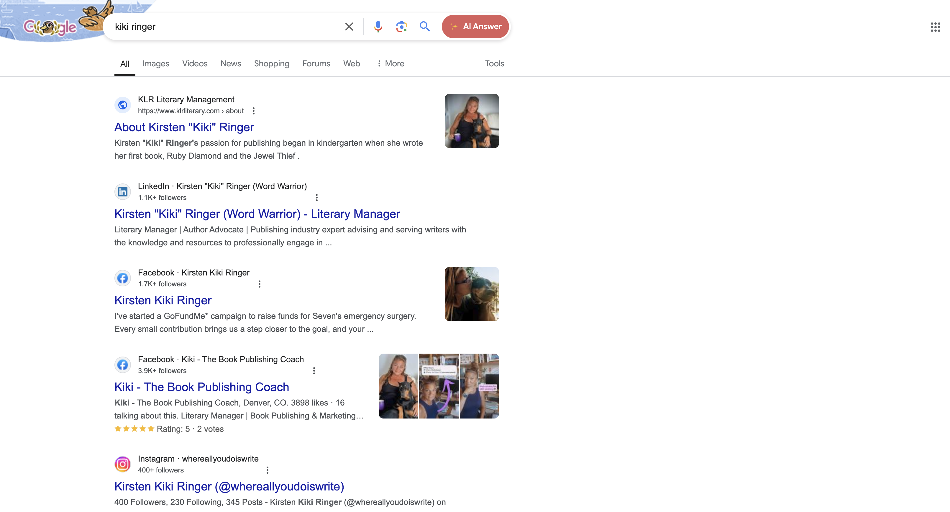 Take Kirsten "Kiki" Ringer, the owner and coach at KLR Literary Management, as an example. Kiki, a founding member of our Plandipity Doer's Community, makes us incredibly proud with her social media presence. When you search for her on Google, her social profiles are displayed in the knowledge panel, showcasing her LinkedIn, Facebook, and Instagram accounts. The search results page also includes previews of her most recent posts, further highlighting the strong relationship between SEO and social media. This visibility underscores the importance of optimizing your social media profiles and content for search engines to enhance your brand’s online presence.