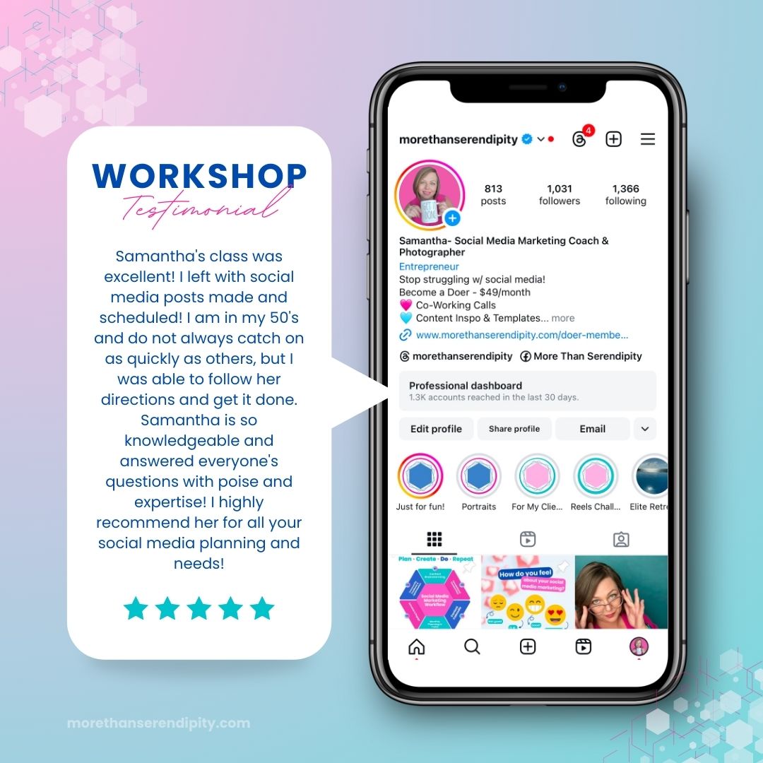 Samantha's class was excellent! I left with social media posts made and scheduled! I am in my 50's and do not always catch on as quickly as others, but I was able to follow her directions and get it done. Samantha is so knowledgeable and answered everyone's questions with poise and expertise! I highly recommend her for all your social media planning and needs!